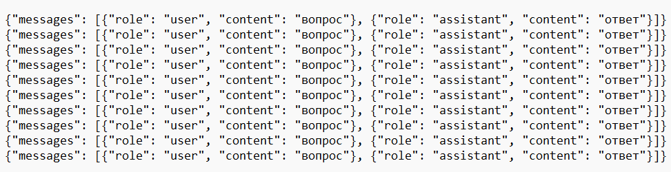 {«messages»: [{«role»: «user», «content»: «вопрос»}, {«role»: «assistant», «content»: «ответ»}]}