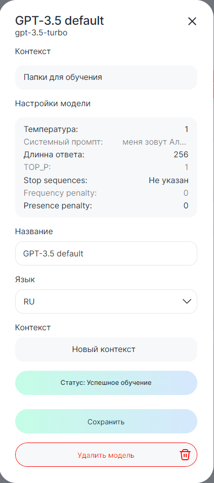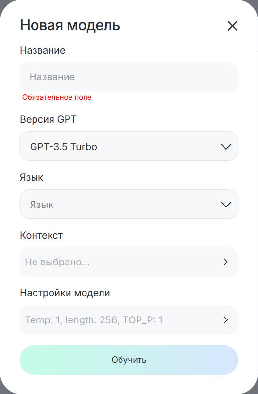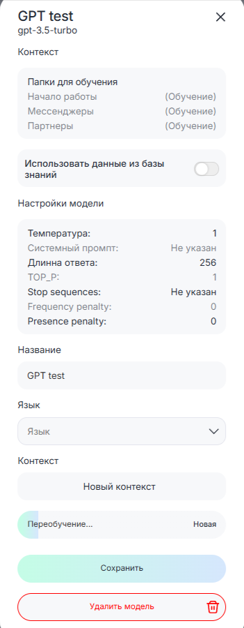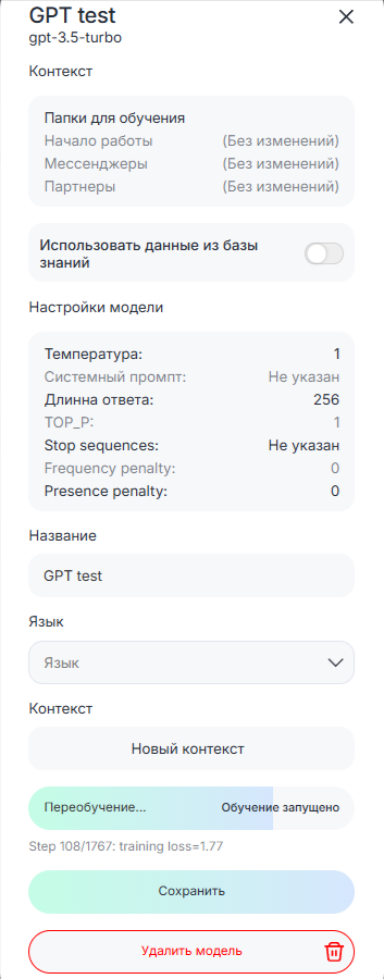 После подключения GPT к боту можно создавать обученные модели. Обучение необходимо, чтобы искусственный интеллект мог отвечать на вопросы о вашей компании.