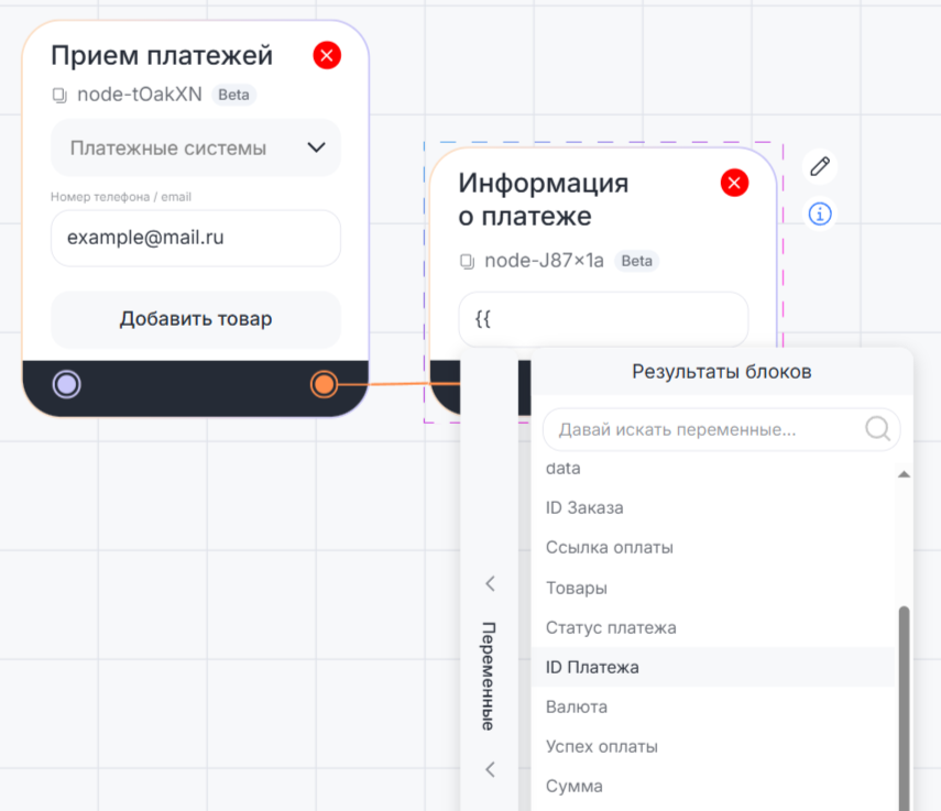 2. Заполните ID платежа. Можно вставить результат блока «Прием платежа» — для этого введите в поле двойные фигурные скобки «{{», откройте раздел «Результаты блоков» и выберите результат блока «Прием платежа» — ID платежа.