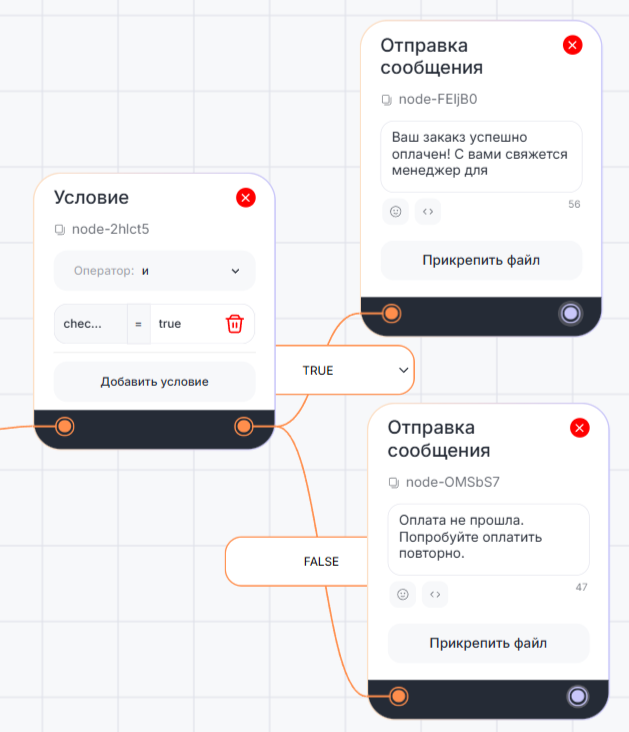 Если результат «true», то можно добавить блок «Отправка сообщения» с уведомлением о успешной оплате. Если «false», то уведомление о том, что оплата не прошла.