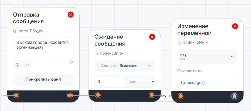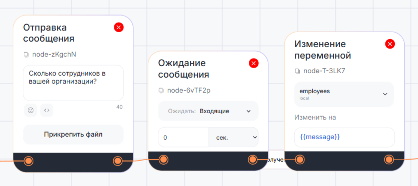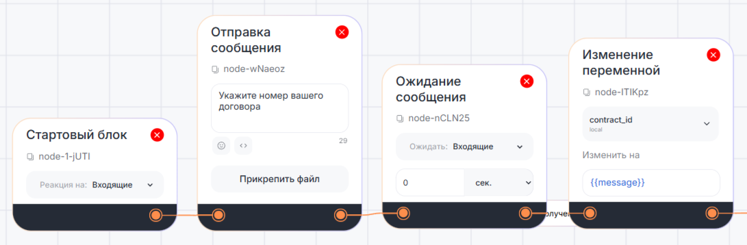 Например, чтобы записать в переменную текст сообщения клиента, укажите: {{message}}. После выполнения блока указанное значение будет записано в выбранную переменную и станет доступно для использования в следующих блоках сценария.