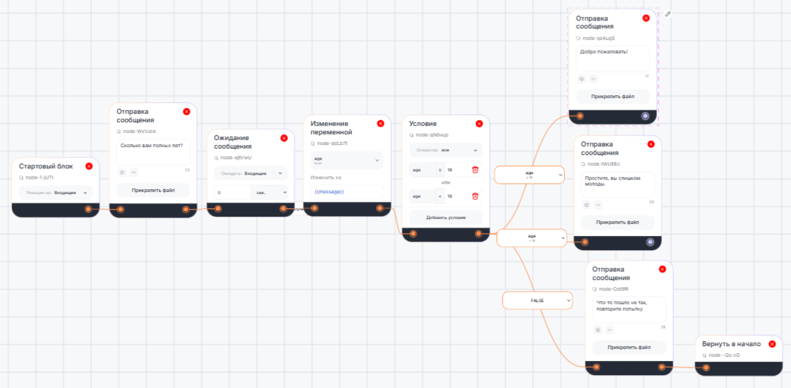 Бот запишет в переменную значение из сообщения клиента. После этого переменную можно использовать, например, для проверки условий в блоке «Условие».