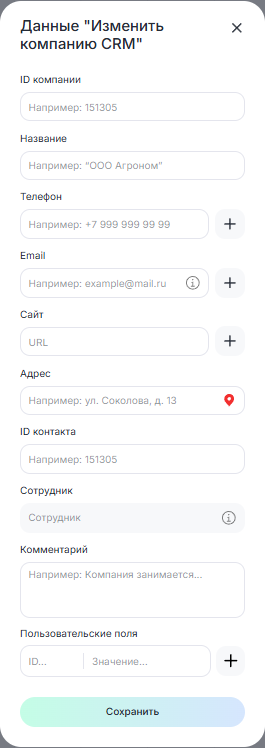 - Блок «Изменить компанию CRM» обновляет данные компании.
