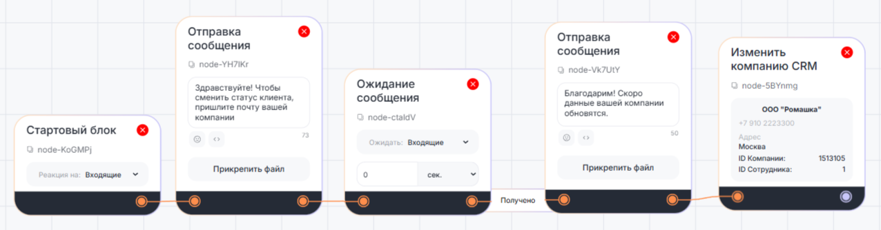 Когда сценарий дойдет до этого блока, в CRM-системе будут автоматически изменены данные компании.