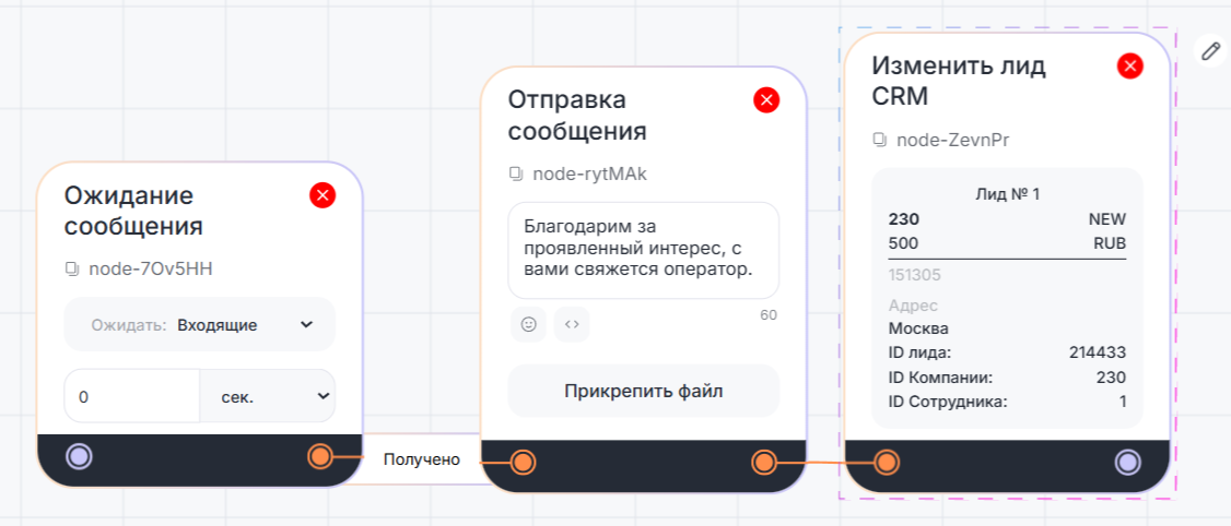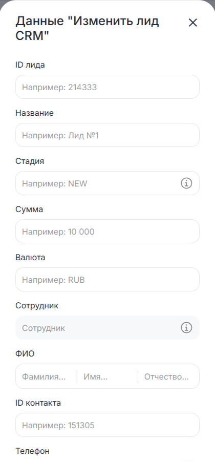 Когда сценарий дойдет до этого блока, в CRM-системе будут автоматически изменены данные лида.