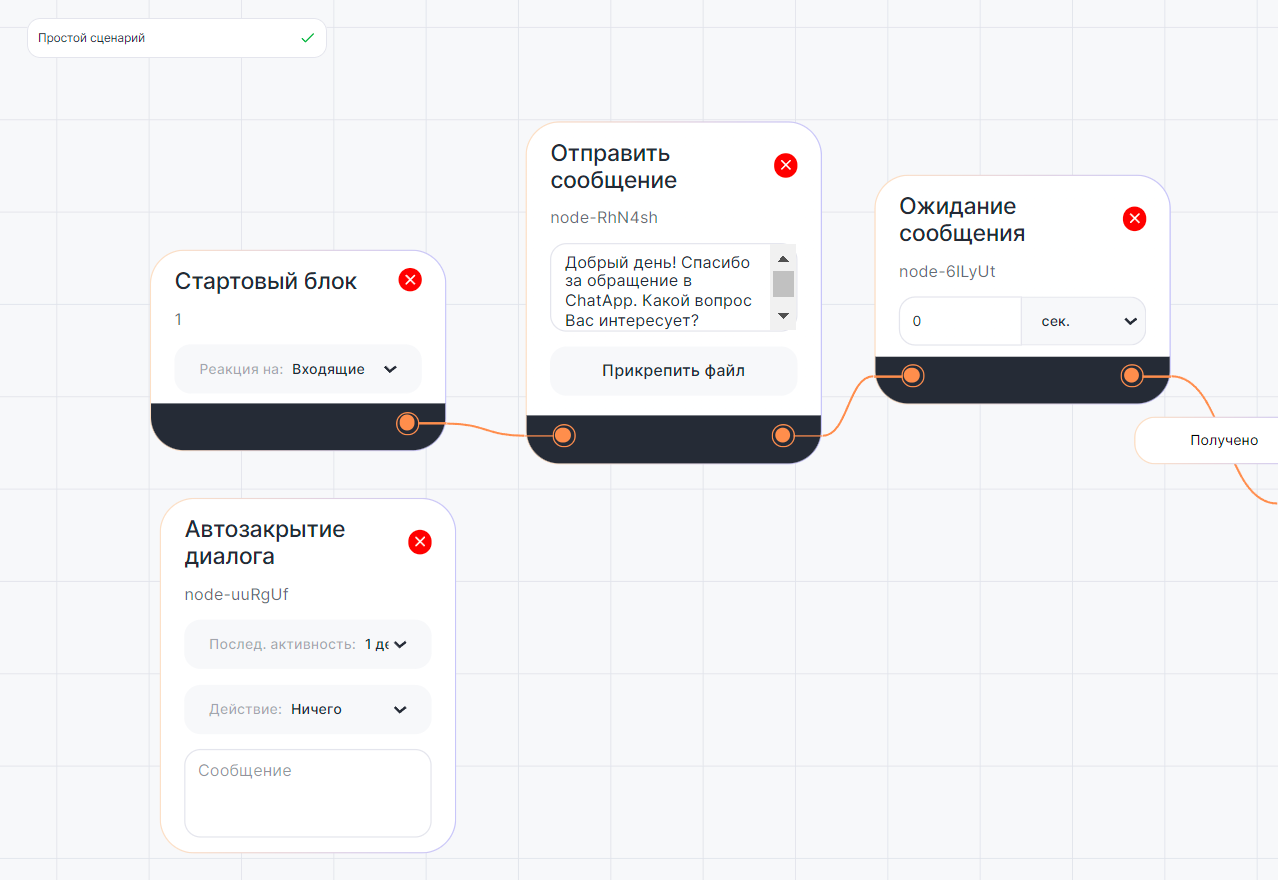 - Автоматически закрывает диалог при отсутствии ответа клиента.