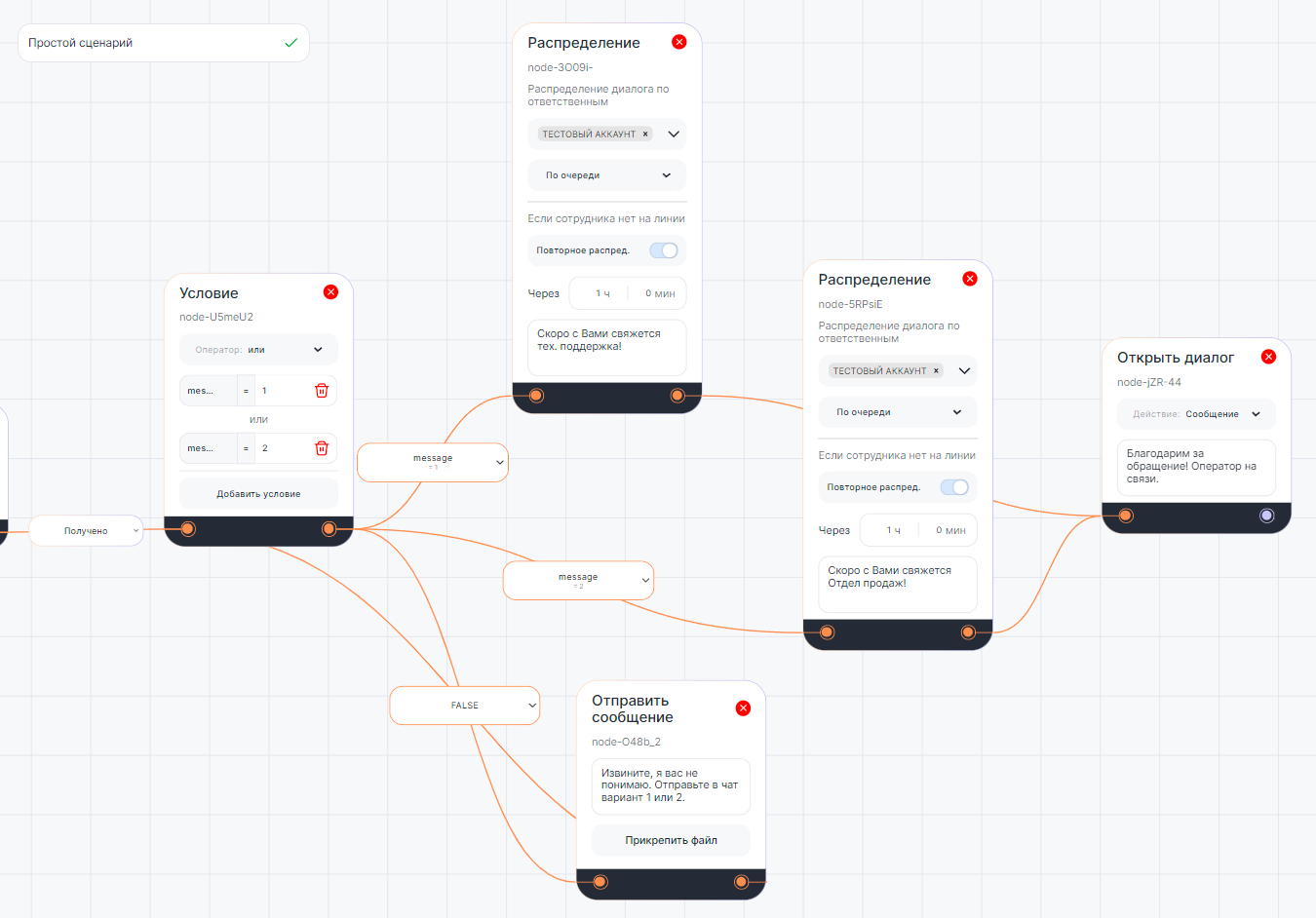 - Соедините условия «1» и «2» с блоком «Распределение» для назначения ответственных сотрудников.