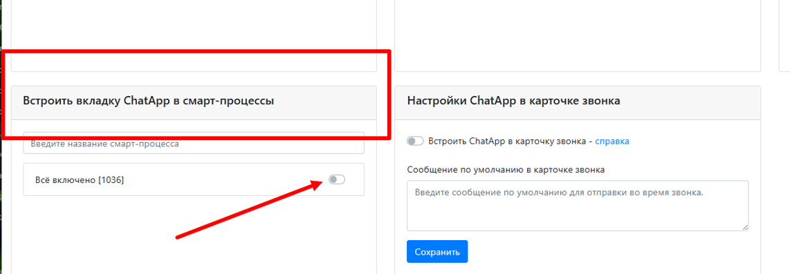 2. Найдите необходимый смарт процесс в разделе «Встроить вкладку ChatApp в смарт-процессы» и включите его с помощью тумблера.