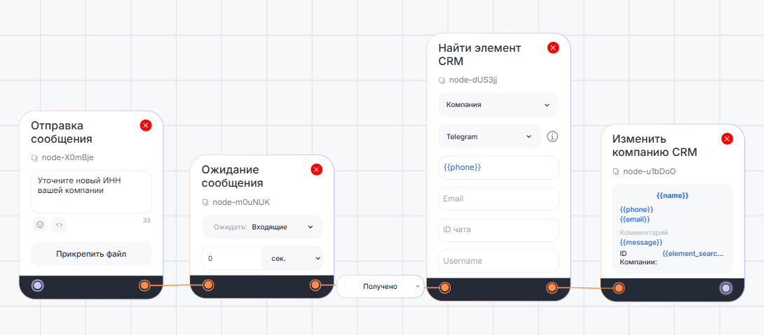 Блоки работы с компаниями CRM используются для автоматического создания и изменения компании в процессе диалога с клиентом. Позволяют фиксировать заказы и обновлять этапы работы без ручного вмешательства.