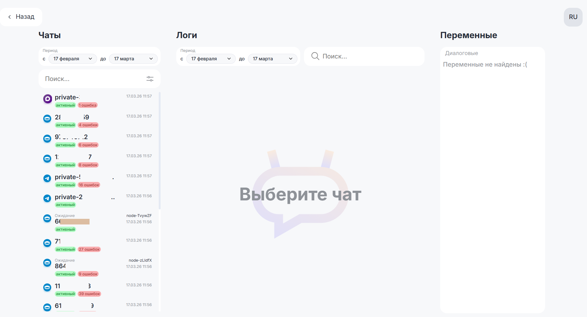 Чаты (указывается chat_id) Список чатов, в которых запускались сценарии. Указывается статус (активный, на паузе, неактивный) и количество ошибок по чату за весь период.