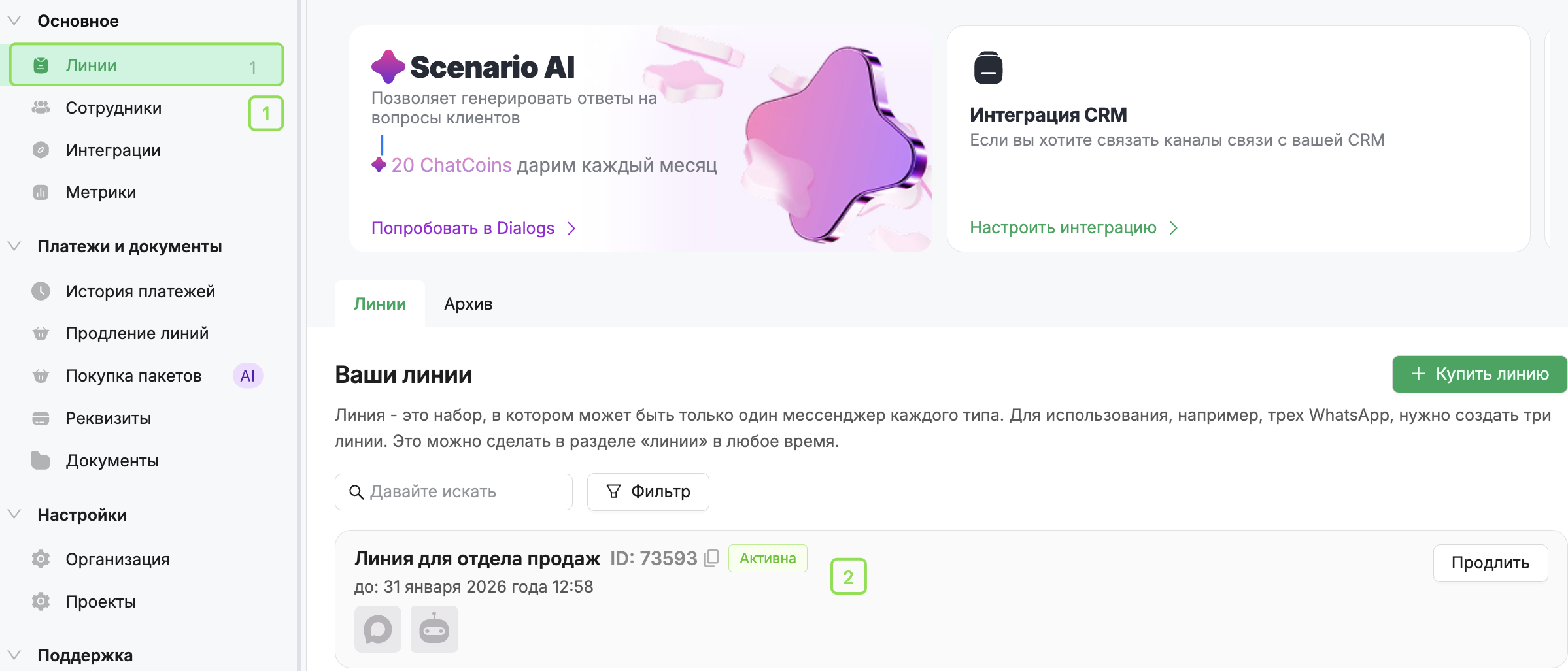 В личном кабинете откройте раздел «Линии» и выберите линию с каналом Max Bot — откроется окно настроек линии.