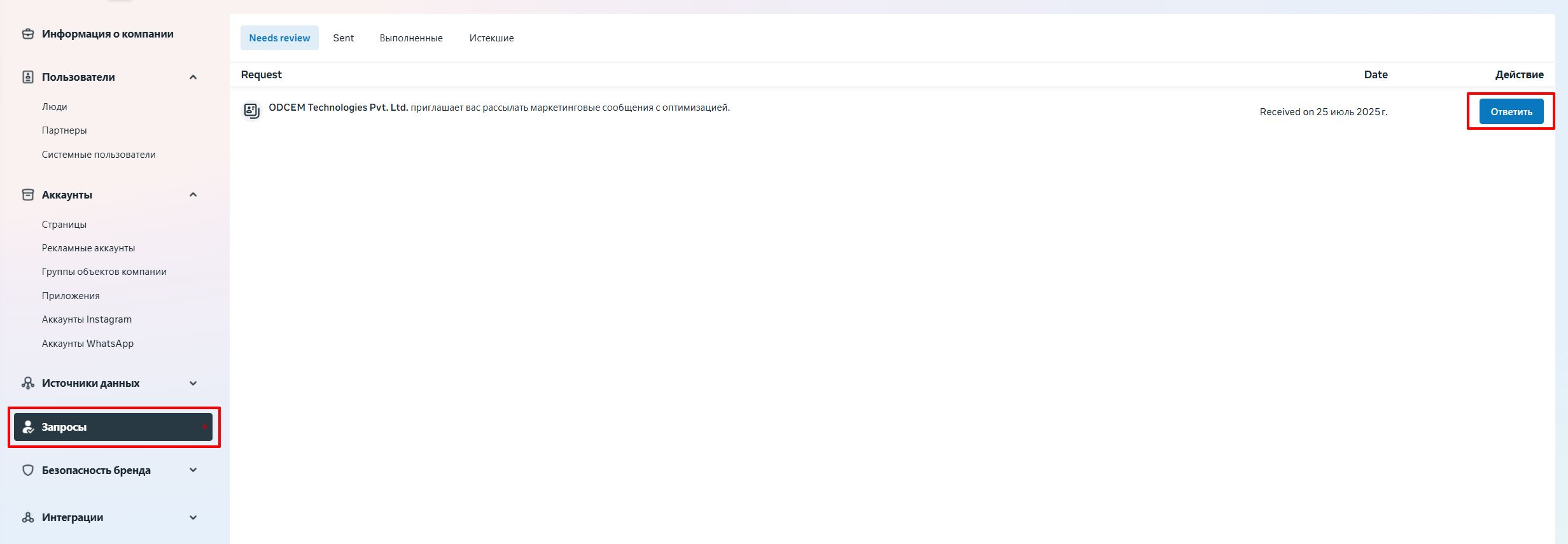 5. В разделе «Получено» вы увидите запрос от «Gupshup» или «OneDirect»