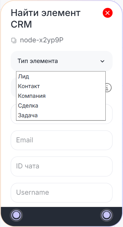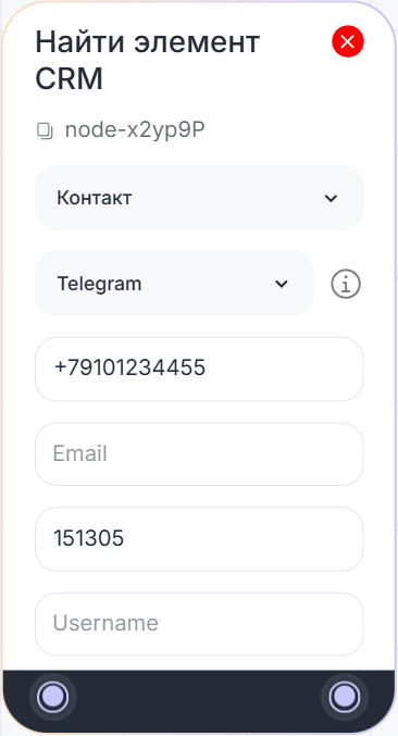 3. Введите значение, по которому будет происходить поиск элемента в CRM — Телефон, Email, ID чата или Username. В поле можно ввести переменную. Можно заполнить несколько полей.