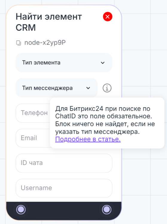 - поиск по ID чата осуществляется только при добавлении поля «Тип мессенджера»;