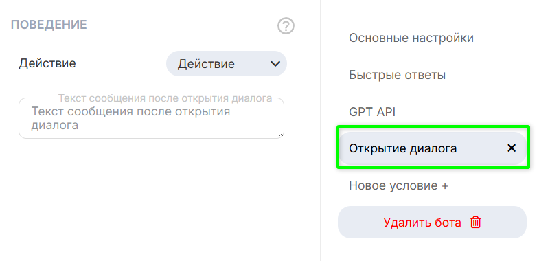 «Сообщение» — укажите текст, который будет автоматически отправлен клиенту при открытии диалога.