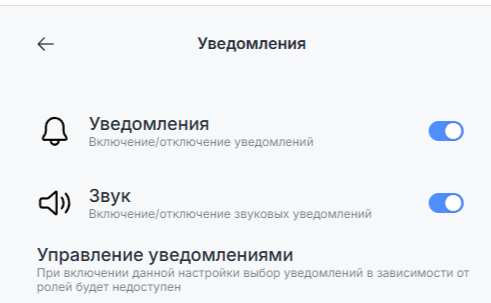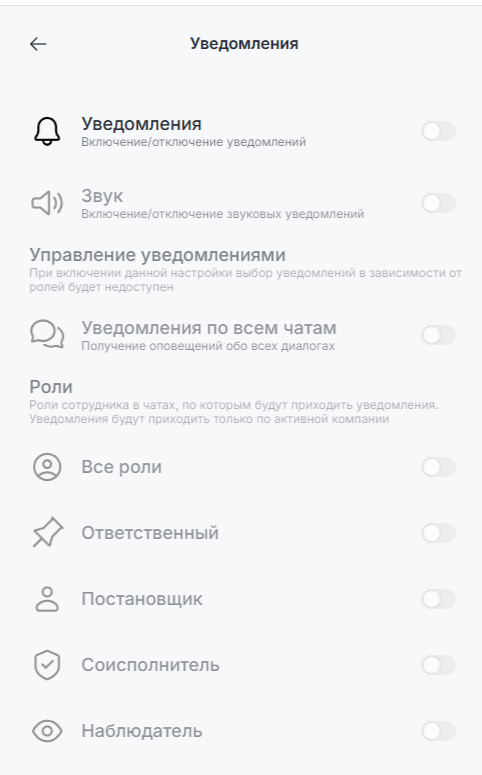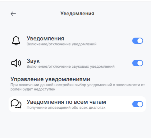 При первом включении уведомлений по умолчанию используется настройка по ролям. Настройка «Уведомления по всем чатам» не активируется автоматически и может быть включена вручную.