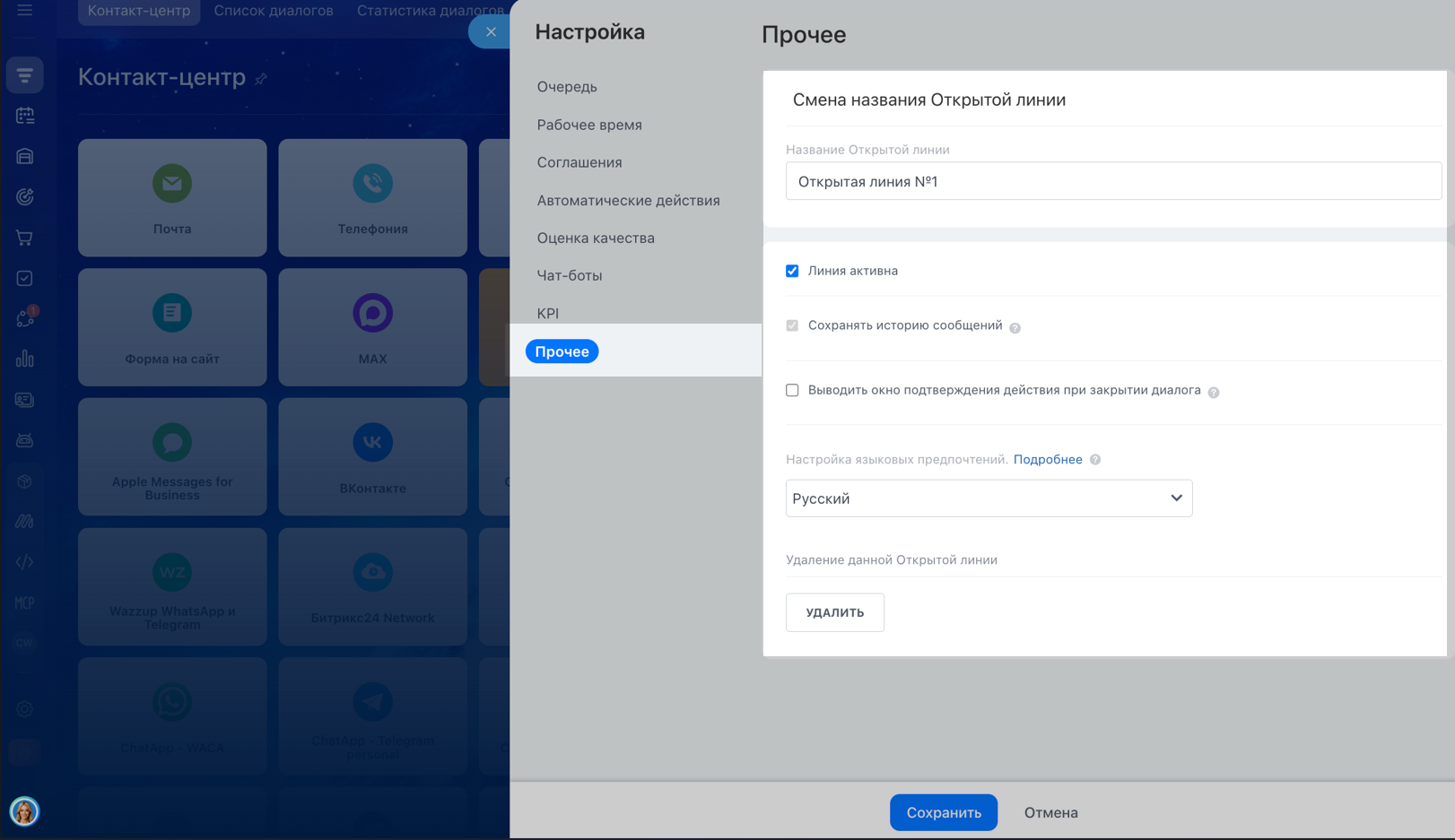 Сохранять историю сообщений — переписка сохраняется в чате, в карточке клиента и в статистике открытых линий.