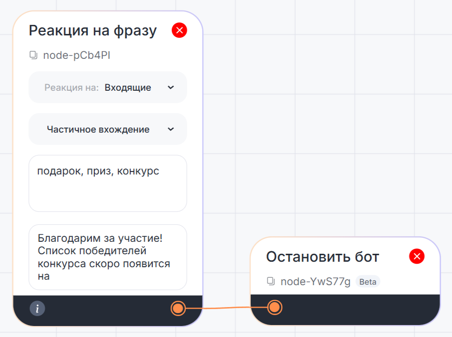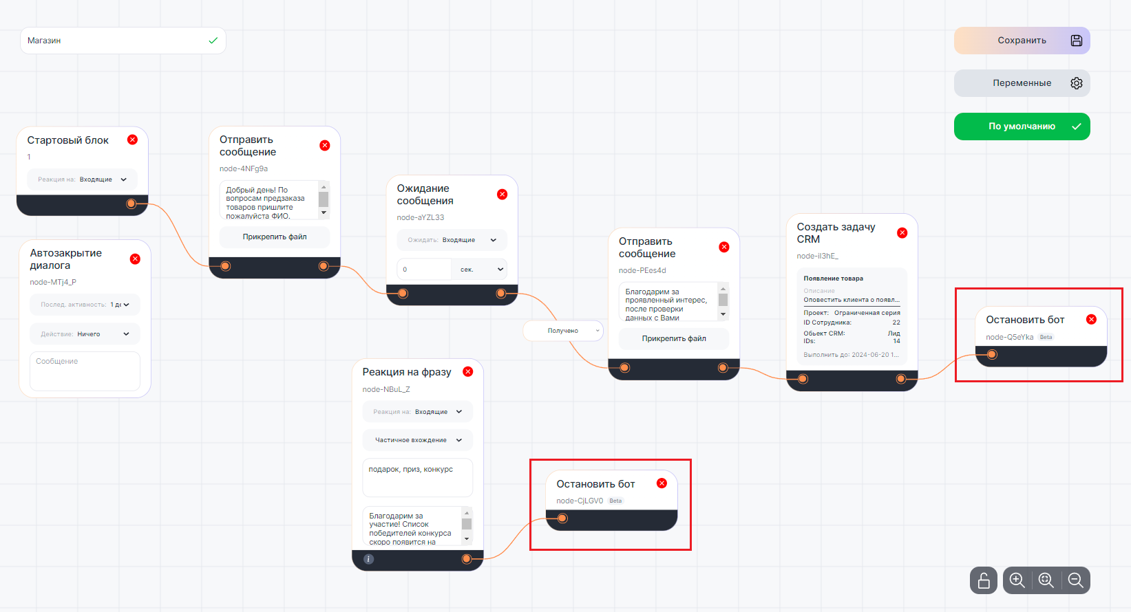 Блок «Остановить бот» может использоваться совместно с блоком «Реакция на фразу».