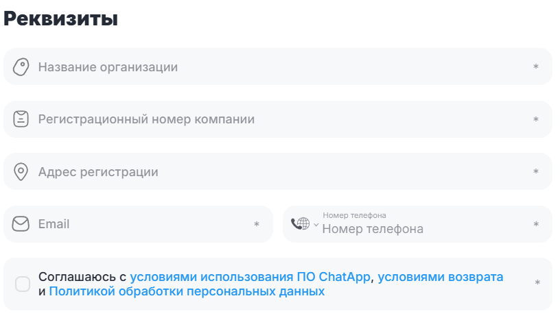 Ознакомьтесь с условиями использования ПО ChatApp, условиями возврата, Политикой обработки персональных данных и подтвердите согласие, установив соответствующую отметку.