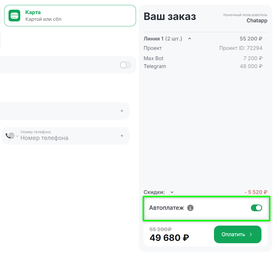 Включите переключатель «Автоплатёж», чтобы разрешить регулярные списания без ручного подтверждения.