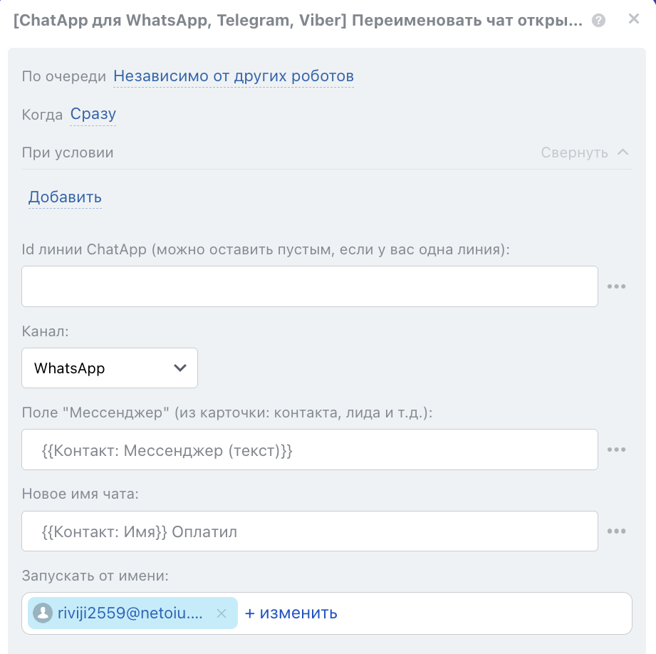 Шаг 4. Выберите робота [ChatApp для WhatsApp, Telegram, Viber] — «Переименовать чат открытой линии».