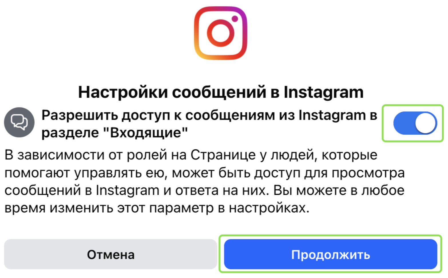 Канал Instagram* не будет работать, если отключён данный тумблер. Если вы случайно выключили его, перейдите в приложение Instagram*: «Настройки» → «Сообщения и ответы на истории» → «Управлять сообщениями» → включите «Разрешить доступ к сообщениям».