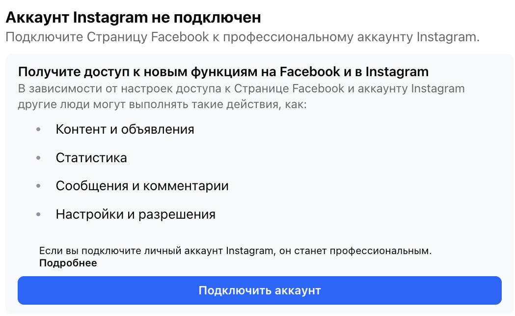 Например, если у вас есть два Instagram-аккаунта, каждый из которых привязан к своей бизнес-странице Facebook, то при подключении к линиям нужно предоставлять доступ сразу к обоим аккаунтам и бизнес-страницам.