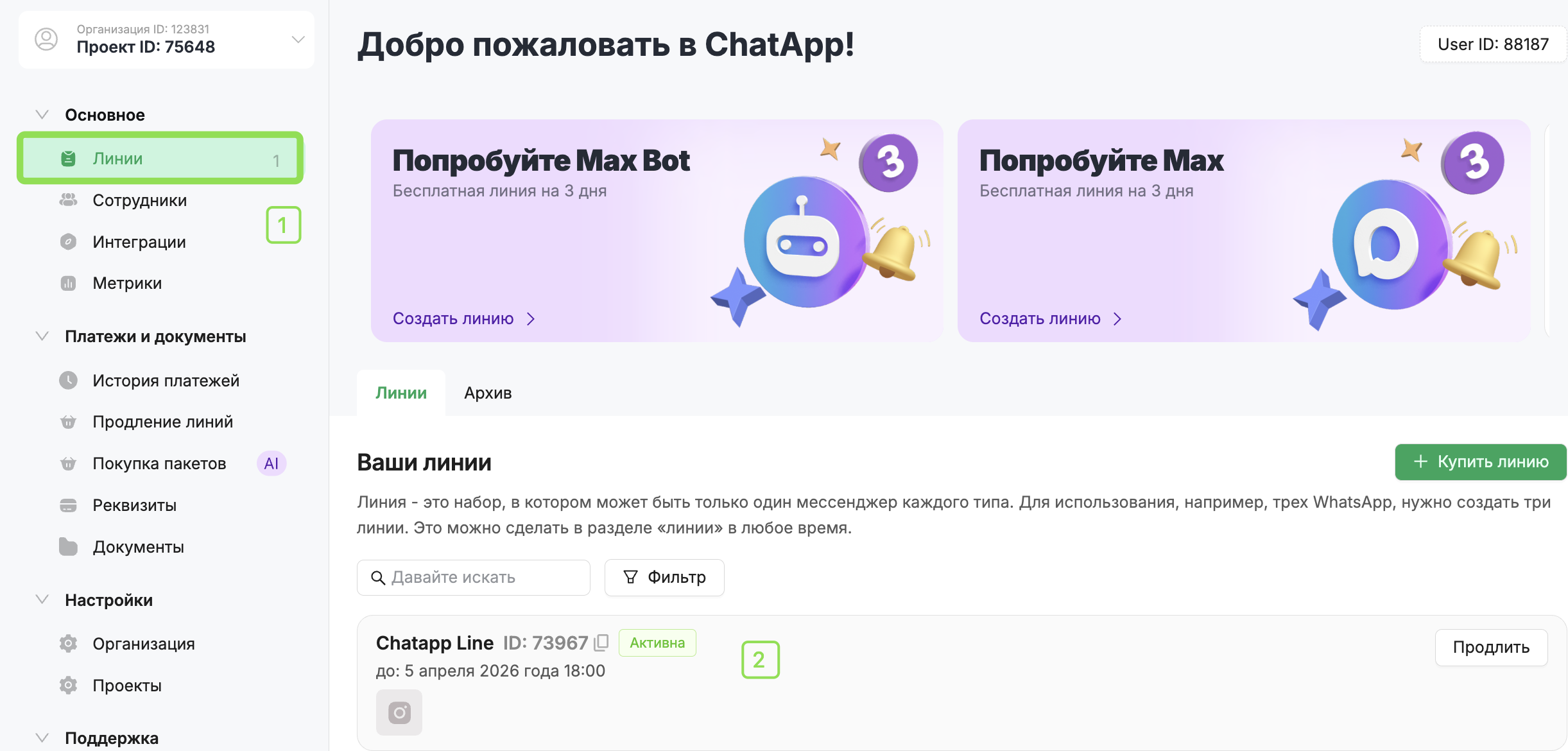 1. В личном кабинете откройте раздел «Линии» выберите линию с каналом Instagram.