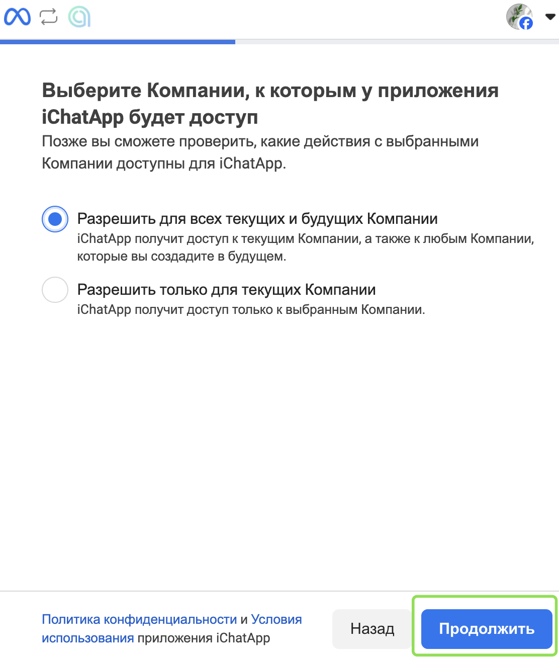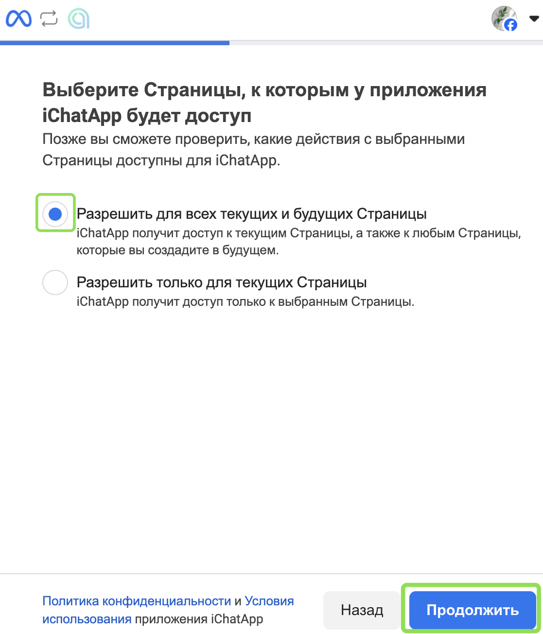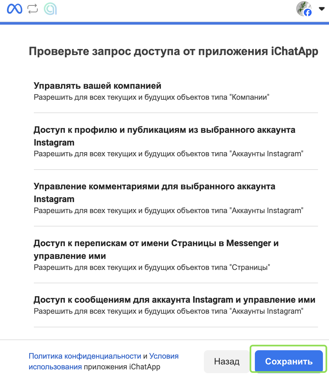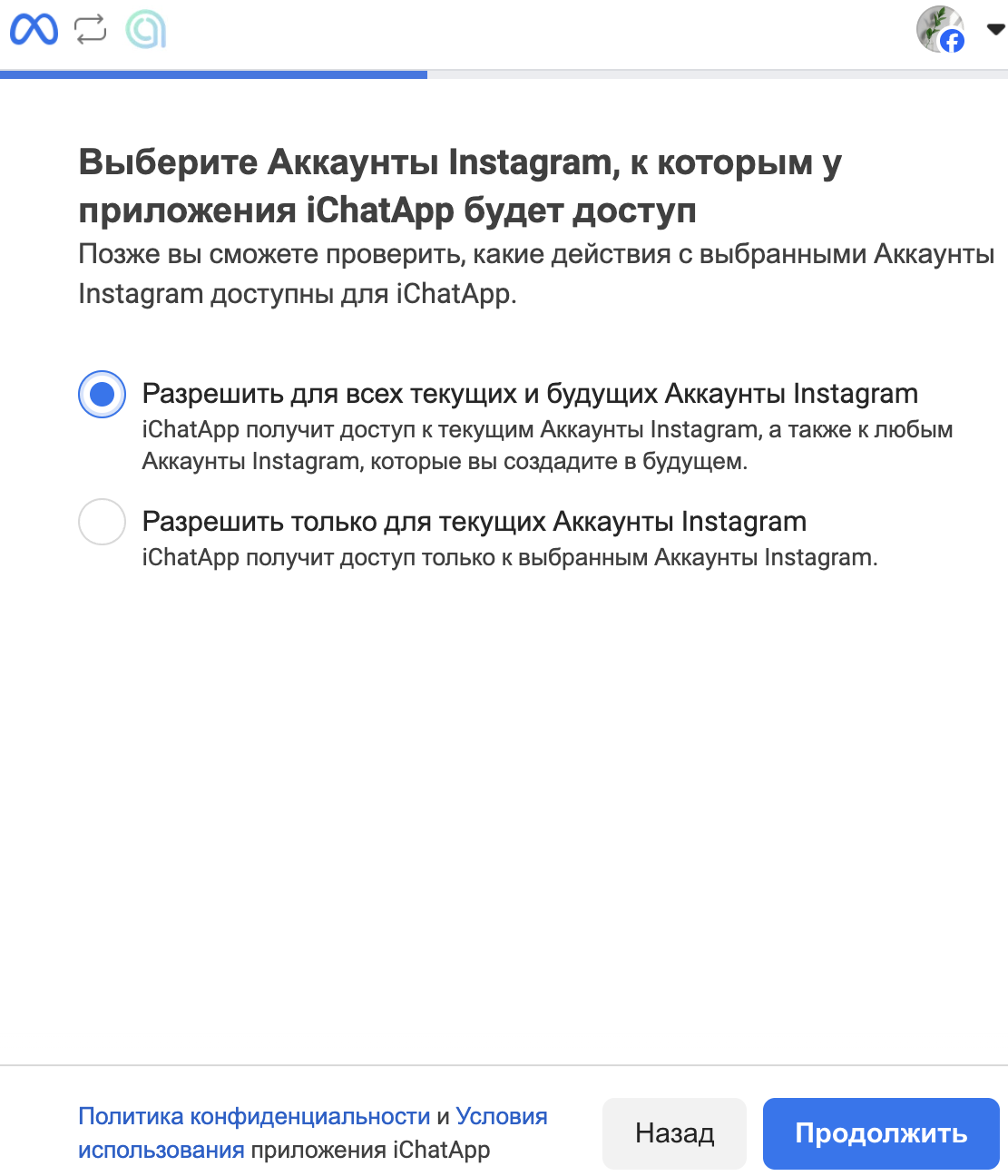 При каждом подключении к линии предоставляйте доступ ко всем страницам Facebook и аккаунтам Instagram, которые планируете использовать в ChatApp.
