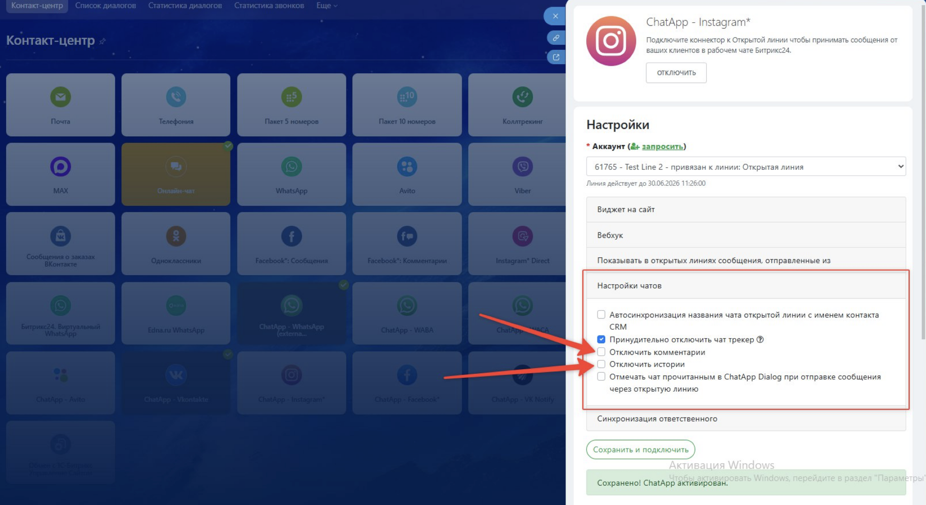 После этого комментарии под постами и Reels Instagram не будут поступать в ChatApp и CRM.