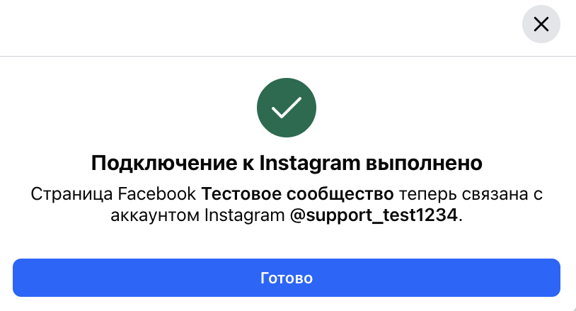 4. Войдите в аккаунт Instagram. После успешной привязки отобразится окно об успешном подключении Instagram к бизнес-странице Facebook.