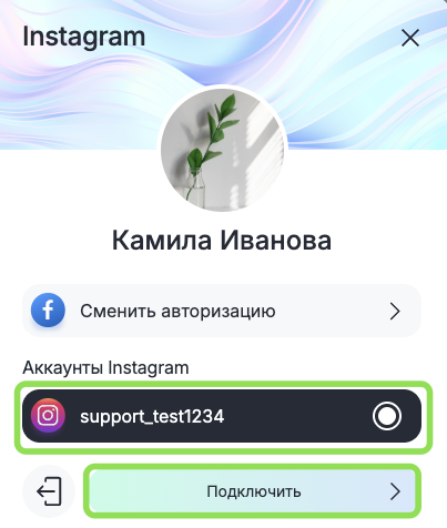 5. После предоставления доступа выберите Instagram аккаунт и нажмите «Подключить».