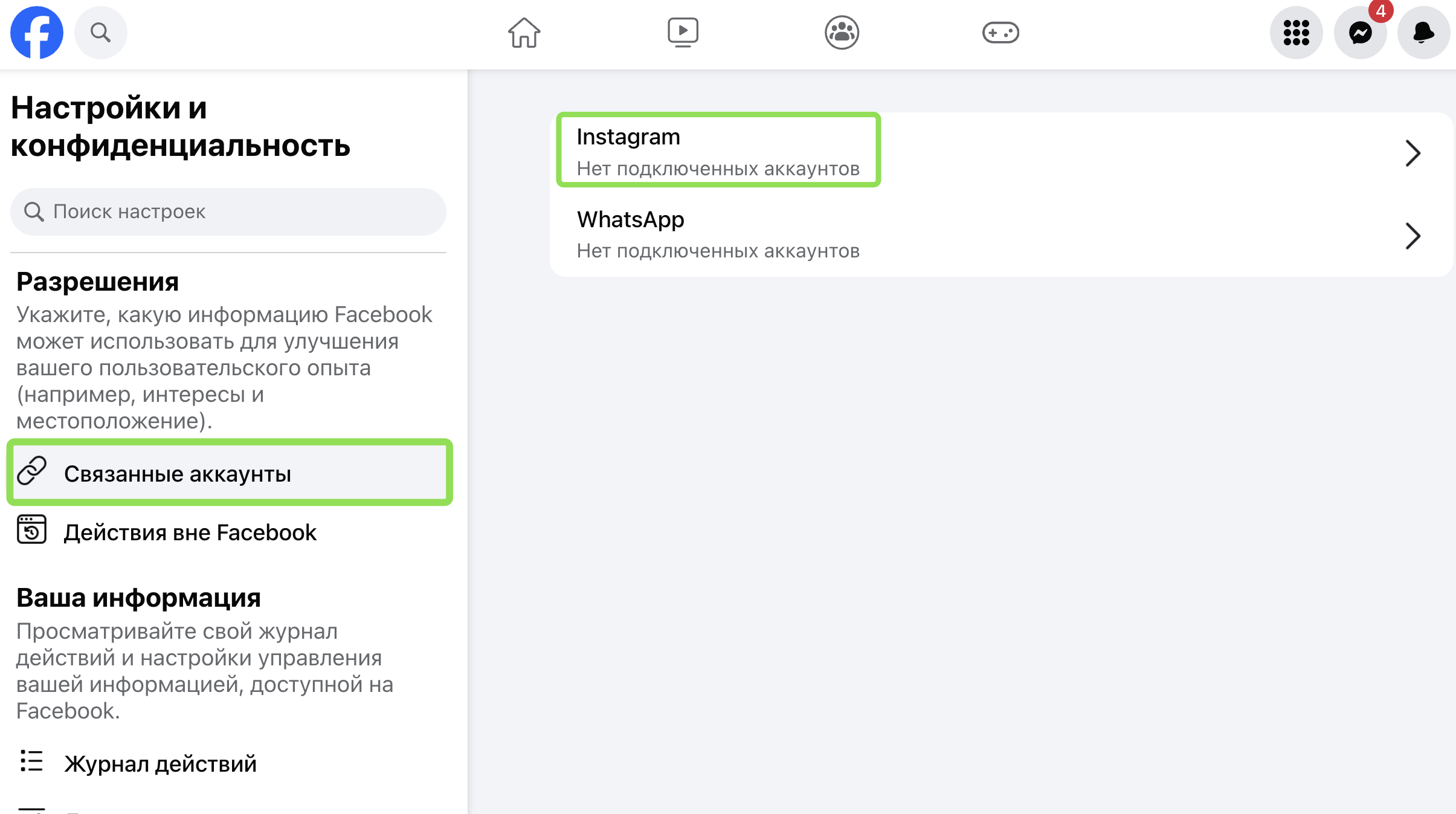 2. Нажмите «Настройки» → «Связанные аккаунты» → Instagram → «Подключить аккаунт» → «Подтвердите подключение».