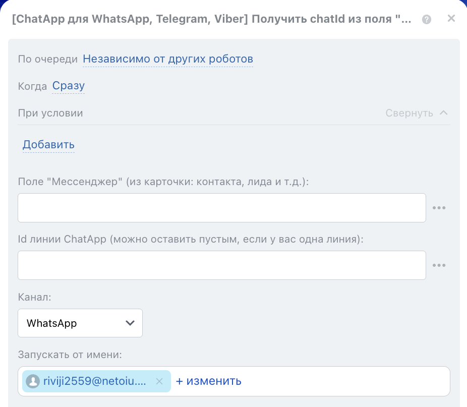Шаг 4. Выберите робота [ChatApp для WhatsApp, Telegram, Viber] — «Получить ChatId из поля Мессенджер».