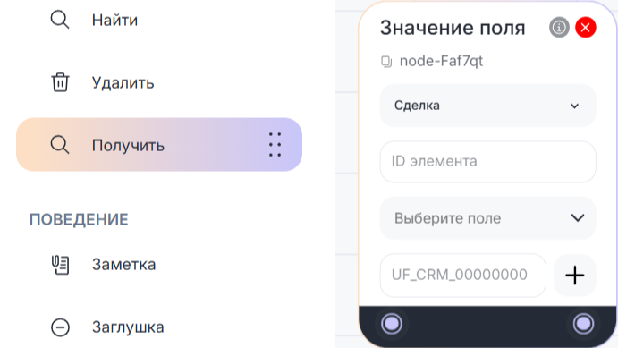 1. В Конструкторе ботов в разделе CRM выберите «Получить» и добавьте блок «Значение поля» в рабочую область.