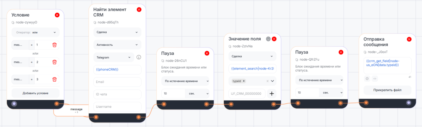 - Если клиент хочет узнать номер заказа, блок «Найти элемент CRM» находит сделку по номеру телефона.