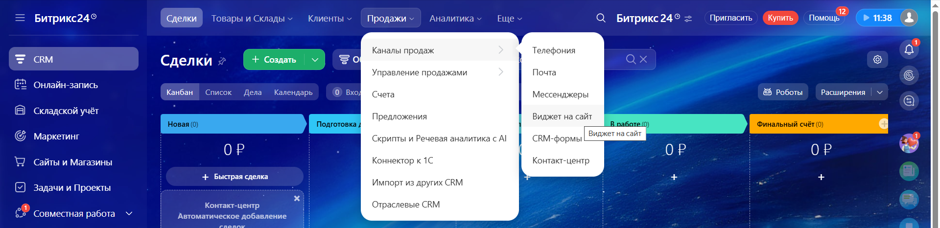 1. В Битрикс24 в меню слева выберите раздел «CRM».