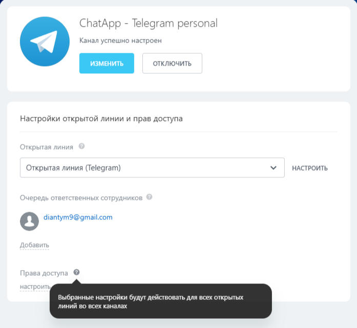 5. Выдайте права доступа нужным сотрудникам. Если права конкретным сотрудникам не выданы, то ChatApp отображается у всех.