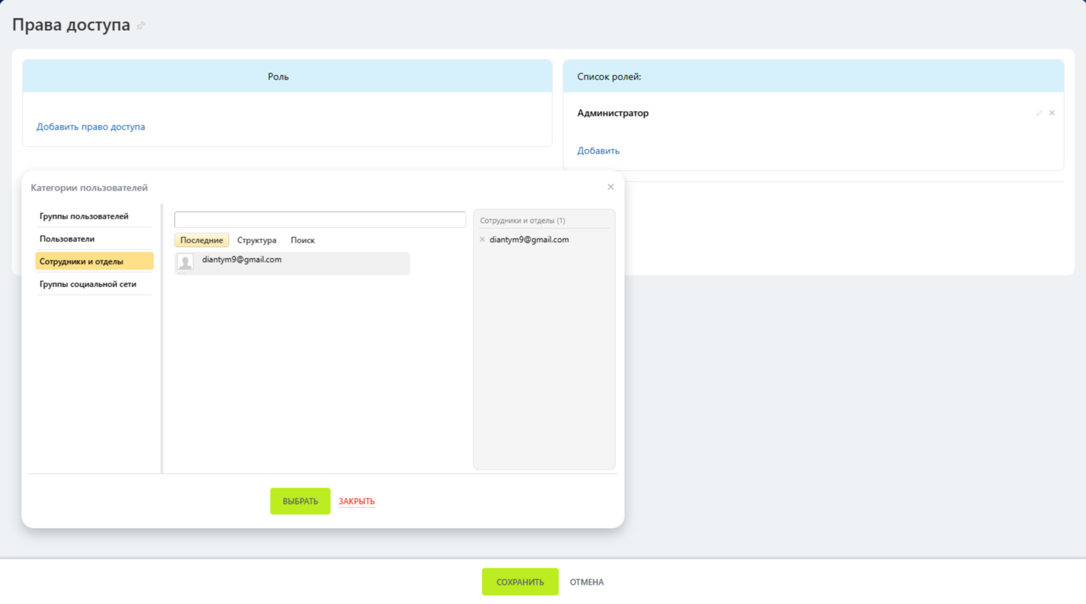 7. Присвойте роль нужному сотруднику или отделу, выбрав её из выпадающего списка ролей.