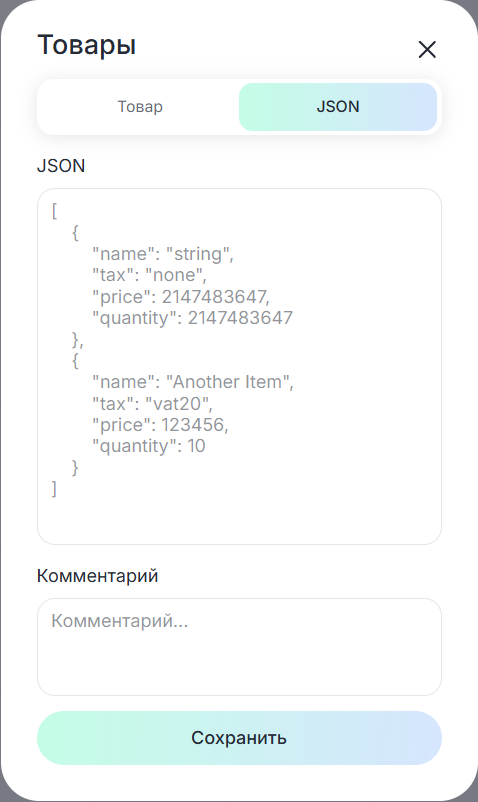 Во вкладке «JSON» можно ввести параметры товара в формате json.