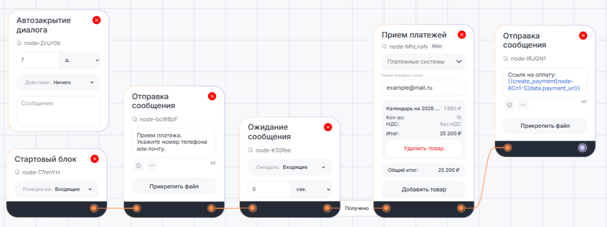 Например, можно создать сценарий, в котором бот запросит у клиента телефон или почту, блок «Прием платежей» инициализирует оплату, а блок «Отправка сообщения» отправит клиенту ссылку для оплаты.