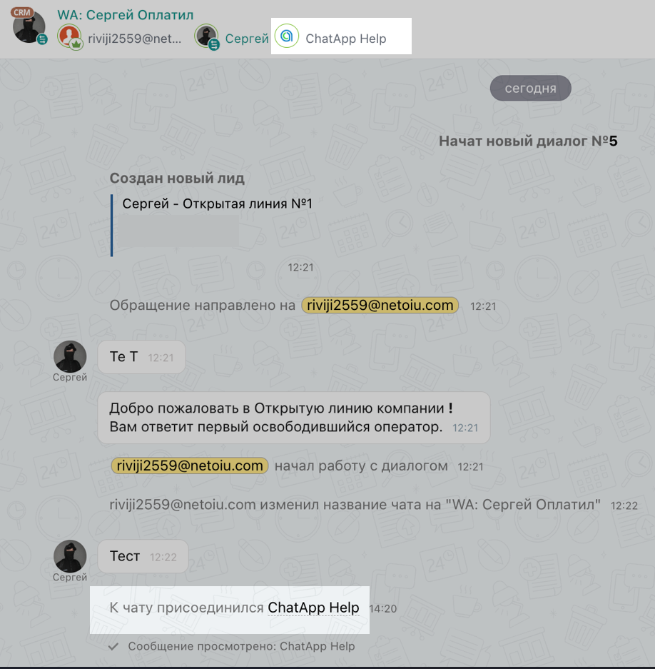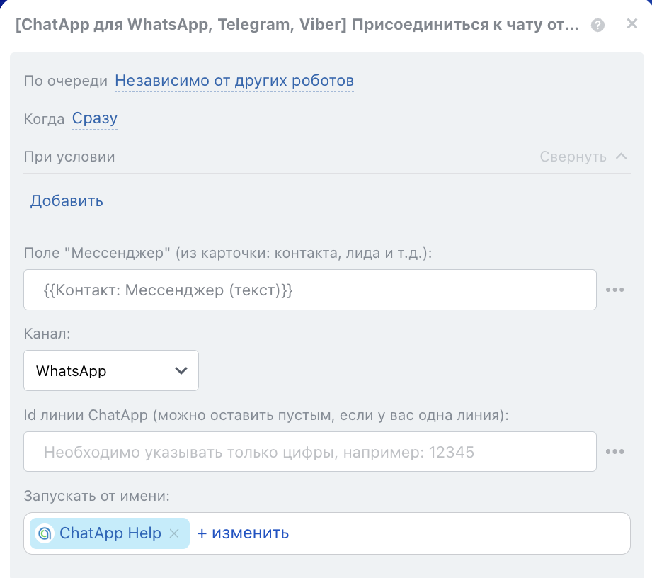 Шаг 4. Выберите робота [ChatApp для WhatsApp, Telegram, Viber] — «Присоединиться к чату открытой линии».