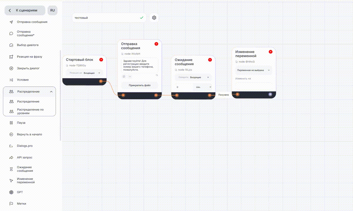 Блок «Распределение» назначает сотрудника, ответственного за диалог. Блок используется, когда бот завершил сбор необходимой информации и требуется подключить к диалогу оператора. После выполнения блока выбранный сотрудник становится ответственным за чат в Scenario Dialogs..