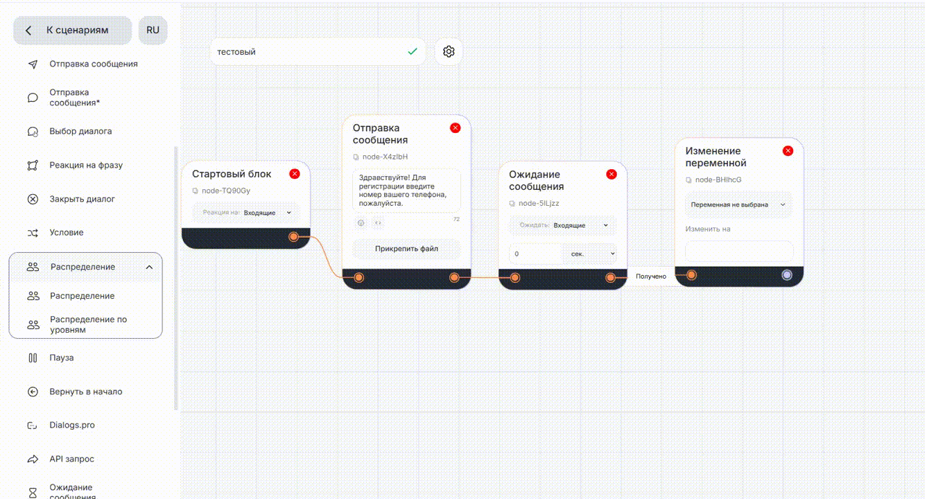 - Перетащите блок «Распределение по уровням» на рабочую область сценария.
