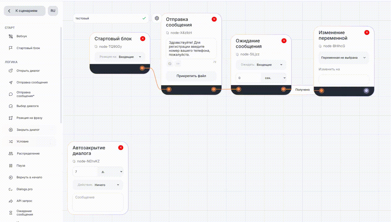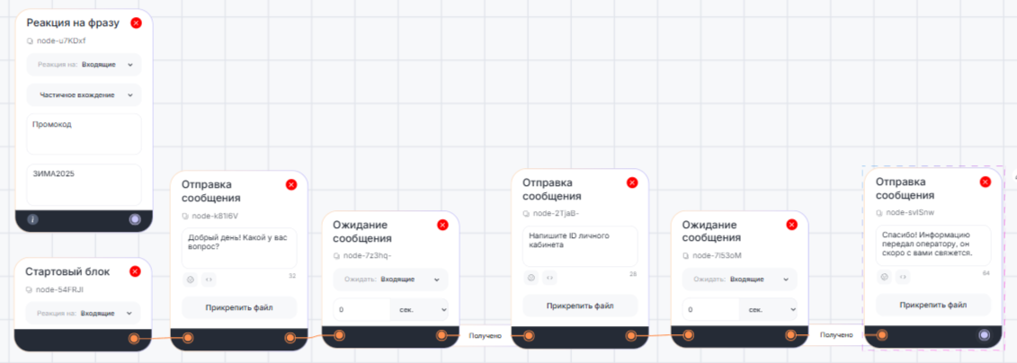 Если в чате появляется ключевое слово, то блок «Реакция на фразу» сработает даже если в чате активна пауза или бот был остановлен. Сценарий продолжит выполнение по ветке, указанной в блоке «Реакция на фразу». Если ветка не указана — пауза не прерывается.