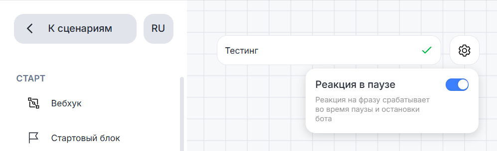 Блок «Реакция на фразу» может прерывать выполнение блоков: «Пауза» и «Остановить бот». Для этого необходимо включить настройку «Реакция в паузе».