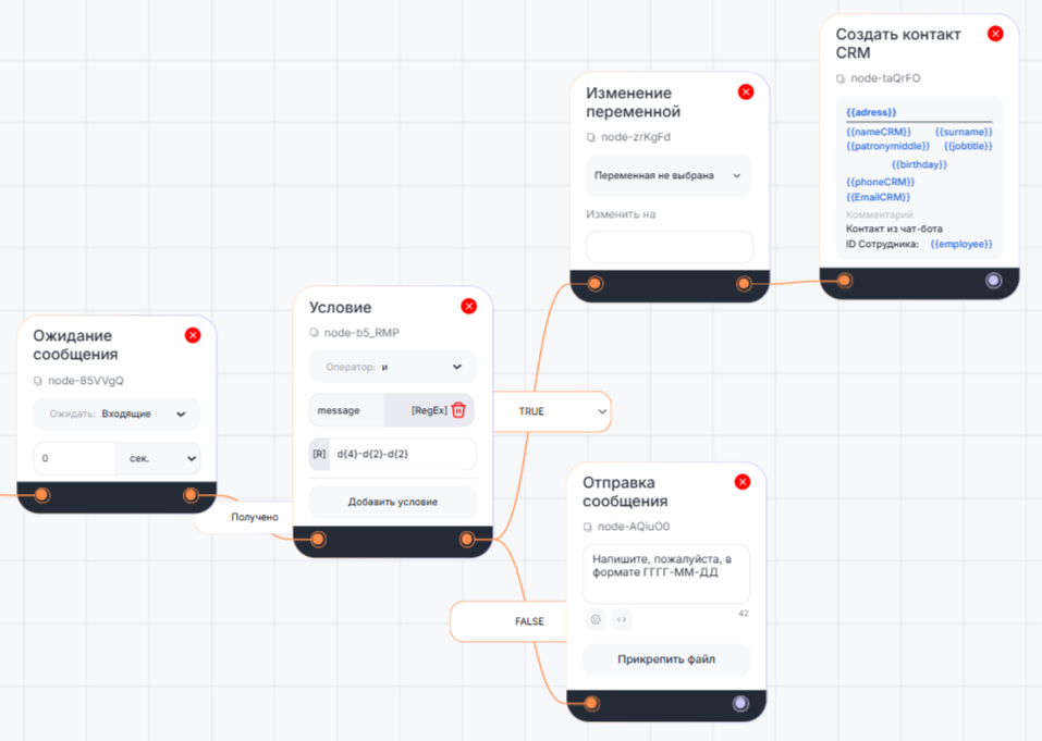 Когда дата рождения будет в верном формате YYYY-MM-DD, блок «Условие» сработает с результатом TRUE. Если формат будет неверным — FALSE.