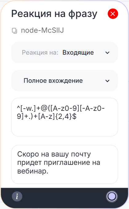Также Regex можно использовать в качестве «ключей» в блоке «Реакция на фразу». Ключ — слово или фраза в сообщении, на которую бот реагирует действием либо ответным сообщением.