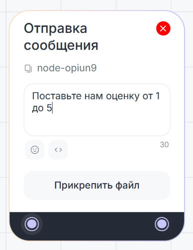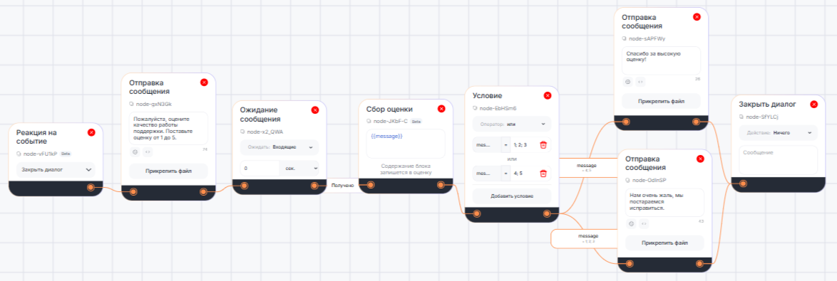 Блок можно использовать, например, в сценарии для технической поддержки. После закрытия диалога бот отправит клиенту сообщение с запросом оценки и сохранит результат в поле «Оценка» раздела «Метрики». В зависимости от выставленной оценки будет отправлено подходящее сообщение.