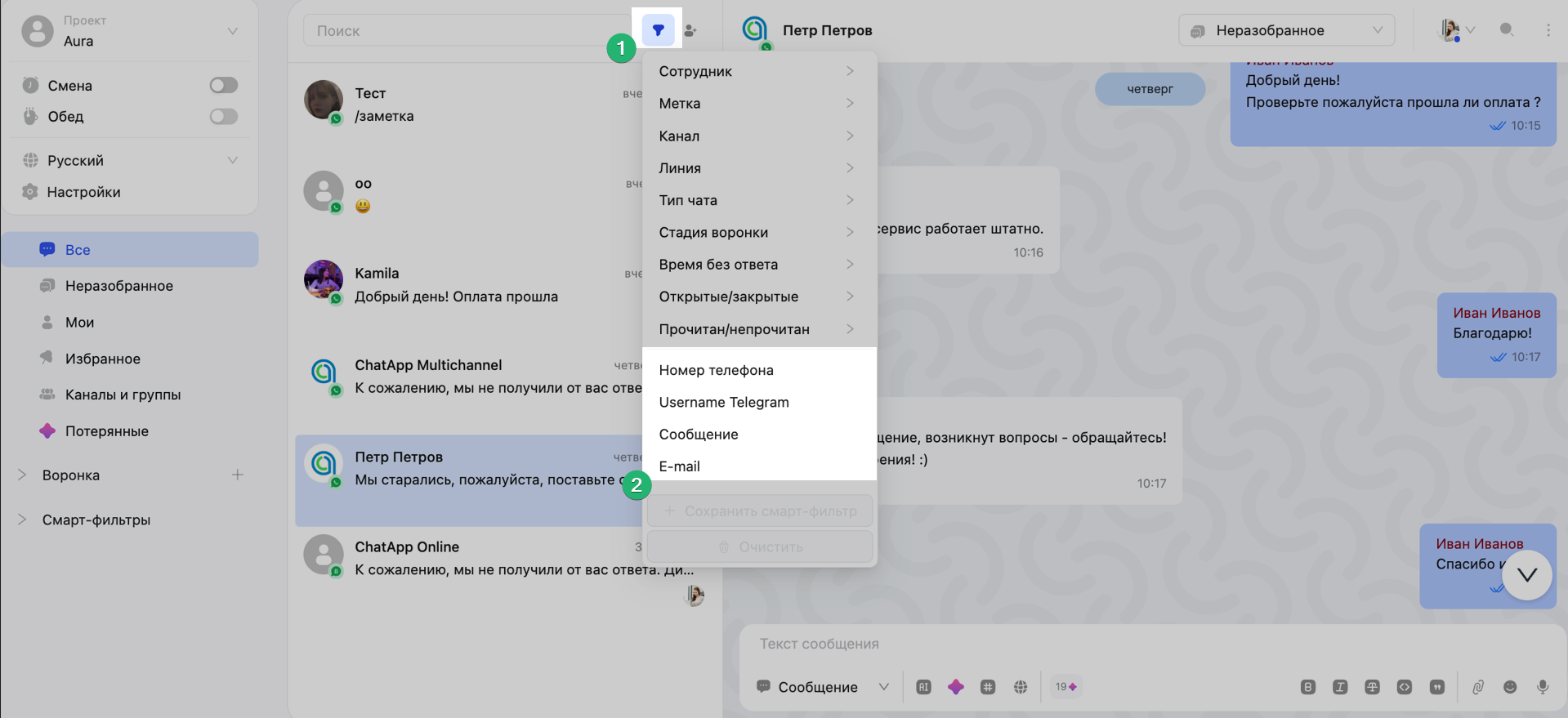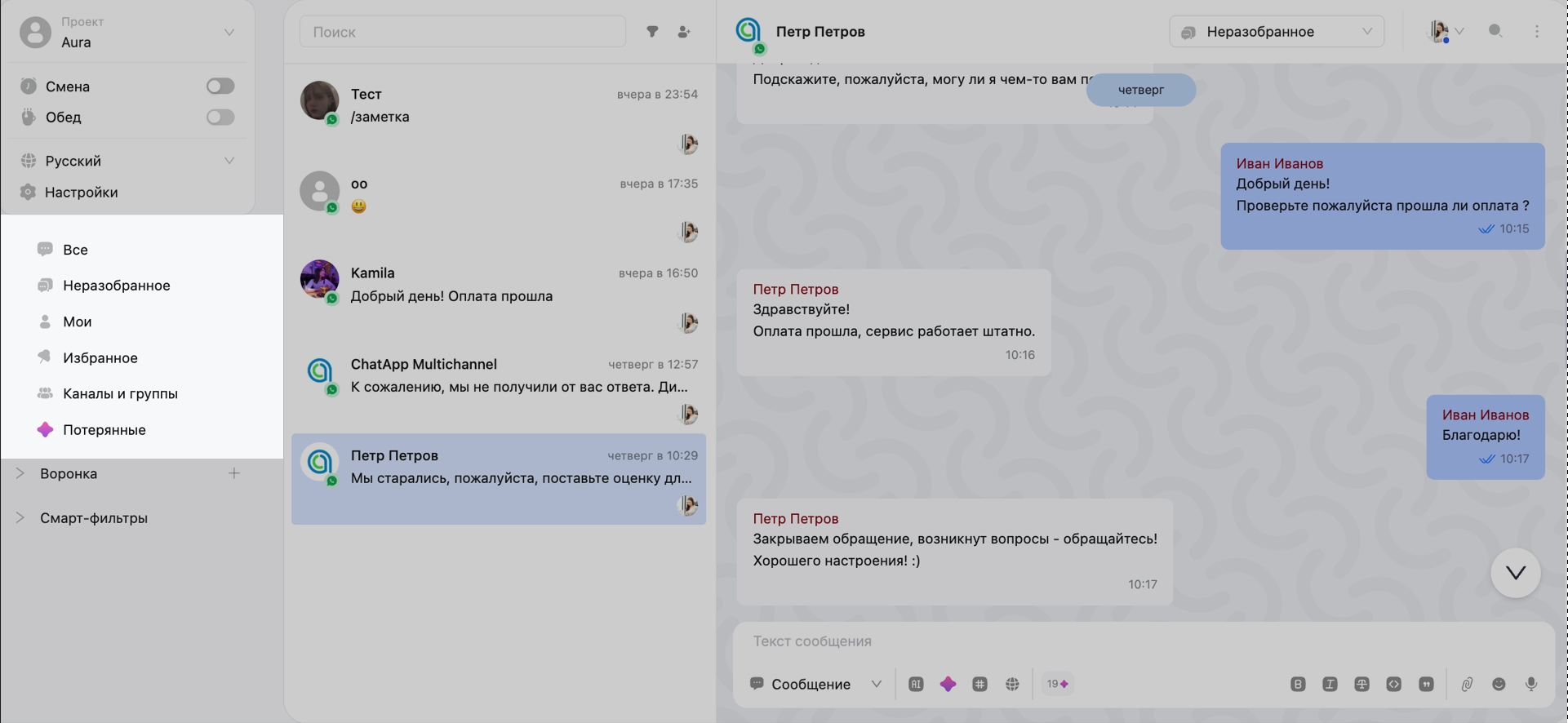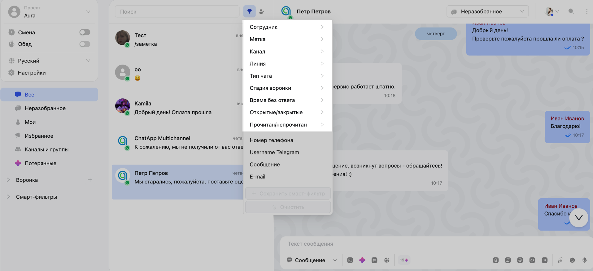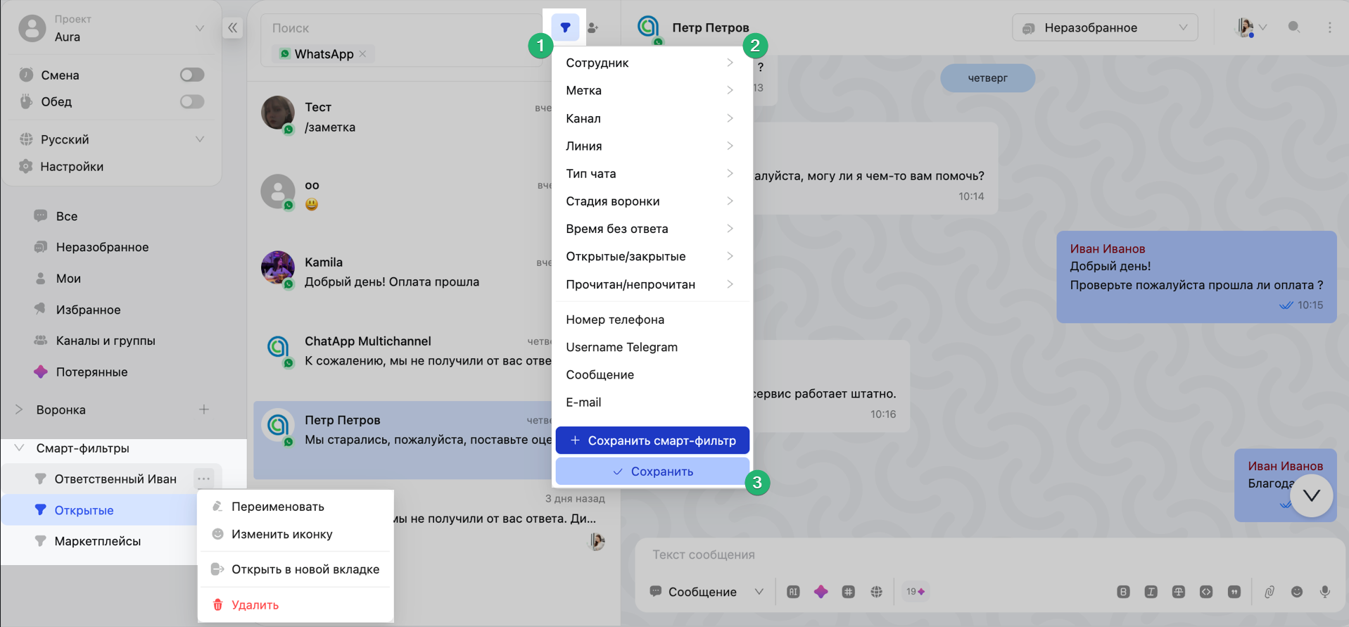Чаты также можно просматривать по папкам — это быстрый способ сегментации.